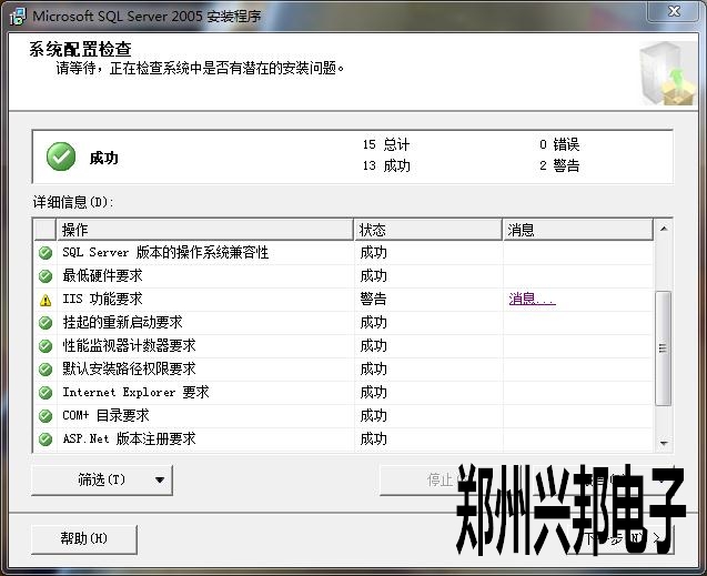 Win7系統2005數據庫安裝時提示IIS功能要求是警告,如下圖所示