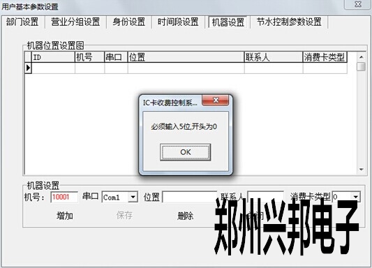 在軟件上添加水控機,售飯機相應的機器號:打開軟件,系統管理---用戶參數設置---用戶基本參數設置---機器設置,在機號那添加相應的機器號,例如10001就是1號機,串口選擇電腦所用的通訊串口。如下圖所示,圖中所用的通訊串口為COM1。但在極其特殊的情況下,會出現錯誤提示,機器號開頭為0。如圖所示。