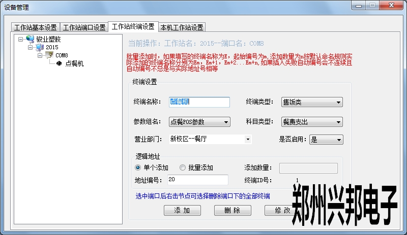 工作站終端設置:在端口地址下添加終端,進行添加時填寫終端名稱,選擇終端類型、參數(shù)組名、科目類型、營業(yè)部門,是否啟用選擇是,添加地址時可以選擇單個添加和批量添加。此地址編號要與機器的編號相同。進行批量添加時填寫添加數(shù)量、地址號,點擊添加后就可以以地址號遞增的形式添加機器。選中終端可以進行修改和刪除操作,選擇端口右擊可以刪除端口下的所有終端。