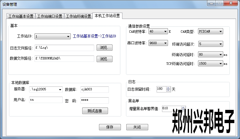本機工作站設置:工作站ID即選擇工作站基本設置中添加工作站的ID號,下面選擇存放日志文件和數(shù)據(jù)文件的地址;通訊參數(shù)設置中CAN波特率默認為40K,串口波特率默認為9600,此處設置不對會導致機器不通訊。終端訪問超次從1到100,默認為5,終端訪問延時從10ms到6000ms,默認為20ms,此處設置會影響監(jiān)控平臺下載參數(shù)和上傳記錄的速度,一般使用默認值;本地數(shù)據(jù)庫設置中服務器選擇數(shù)據(jù)庫2005的服務器名,數(shù)據(jù)庫填寫創(chuàng)建采集庫的數(shù)據(jù)庫名稱,用戶名sa,密碼為hnzz,設置后點擊測試連接,看能否連通;日志保留時間和增量黑名單警界值可以自主更改。