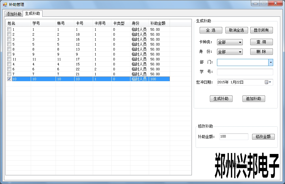 對于添加完成的補助,進行生成補助。對添加補助的信息可以按照卡種類,身份,部門,學號進行查詢選擇限定條件的人員進行補助,選中補助信息可以修改補助金額。選擇刪除后此補助計劃就沒有了。