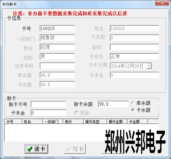 校園一卡通軟件補辦新卡是針對原卡丟失或者損壞,換一張新的卡片。新卡中的信息與原卡相同,在進行操作時輸入原卡卡號,按回車鍵,出現原卡基本信息,然后將新卡放在讀卡器上,點擊讀卡再寫卡,即完成補辦新卡的操作。新卡可在機器上使用,而舊卡在軟件中會顯示此卡未發行,在機器上會出現4-err的提示。即使重新發行,在機器上操作還是顯示掛失卡,必須進行解掛后才能使用。需要注意的是補辦新卡必須要在數據采集和庫采集完成后再進行操作。