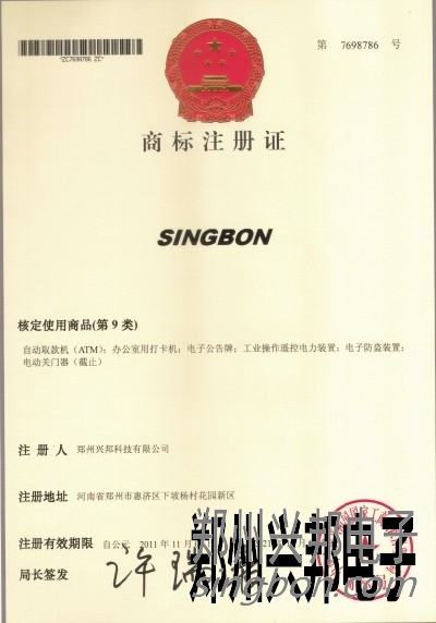 2011年11月,興邦電子獲得國家工商管理總局頒發的(SINGBON)商標注冊證書,有效期10年。
