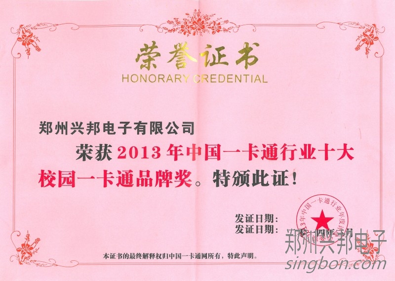 興邦電子榮獲2013年度十大校園一卡通品牌,此獎(jiǎng)牌由中國一卡通網(wǎng)評(píng)選、頒發(fā)