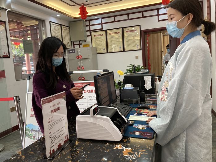 亳州市花戲樓景區(qū)售票處,江蘇游客正在刷社保卡購(gòu)買(mǎi)門(mén)票。 劉景俠攝